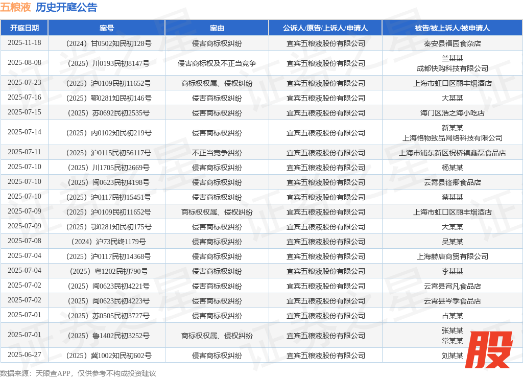 案号:(2025)沪0104民初7571号审理法院:上海市徐汇区人民法院案由:侵害商标权纠纷当事人信息: 原告/上诉人:宜宾五粮液股份有限公司 被告/被上诉人:阳泉浩磊百货商行、尹某某、上海寻梦信息技术有限公司开庭日期:2025年6月20日根据统计,近一年内以宜宾五粮液股份有限公司为当事人的历史开庭公告有412则,其中案由为“侵害商标权纠纷”的公告以365则居首,其次为“商标权权属、侵权纠纷”有20则,“侵害外观设计专利权纠纷”有6则。历史开庭公告(前20条)如下: