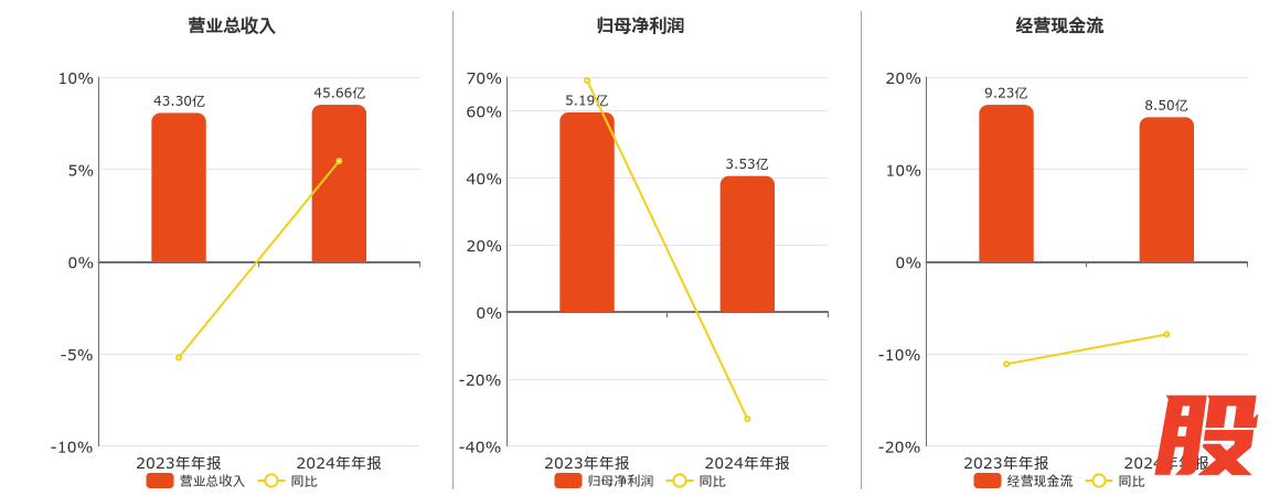 公司营业总收入为45.66亿元。归母净利润为3.53亿元,较去年同报告期归母净利润减少1.65亿元策略红,同比较去年同期下降31.88%。经营活动现金净流入为8.50亿元,较去年同报告期经营活动现金净流入减少7281.58万元,同比较去年同期下降7.89%。